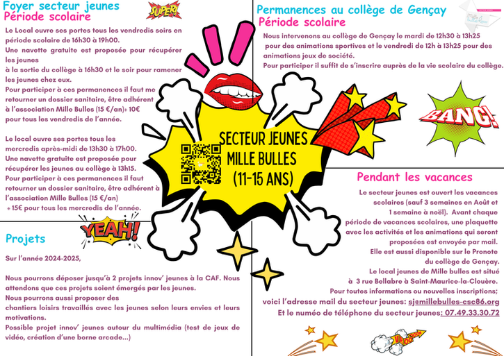 Le mercredi après-midi de 13h30 à 17h00 et 1 vendredi par mois pour veillée de 16h30 à 22h00, le secteur jeunes de Mille bulles vous ouvre ses portes pour diverses animations ainsi que pour monter des projets.